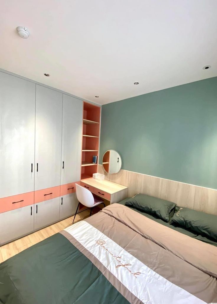 Giường thấp, tủ cao kịch trần, rèm hai lớp, ánh sáng dịu.
