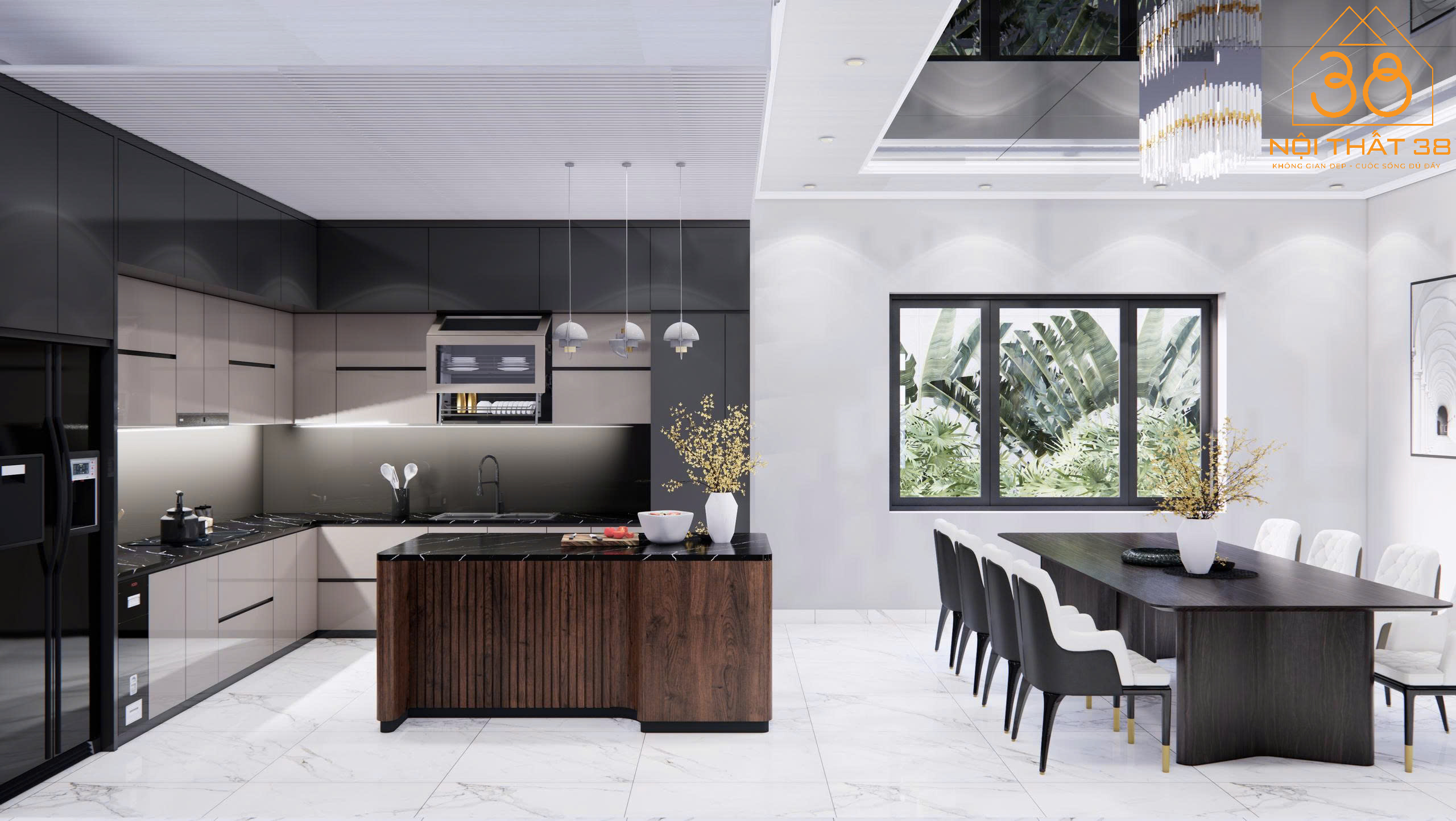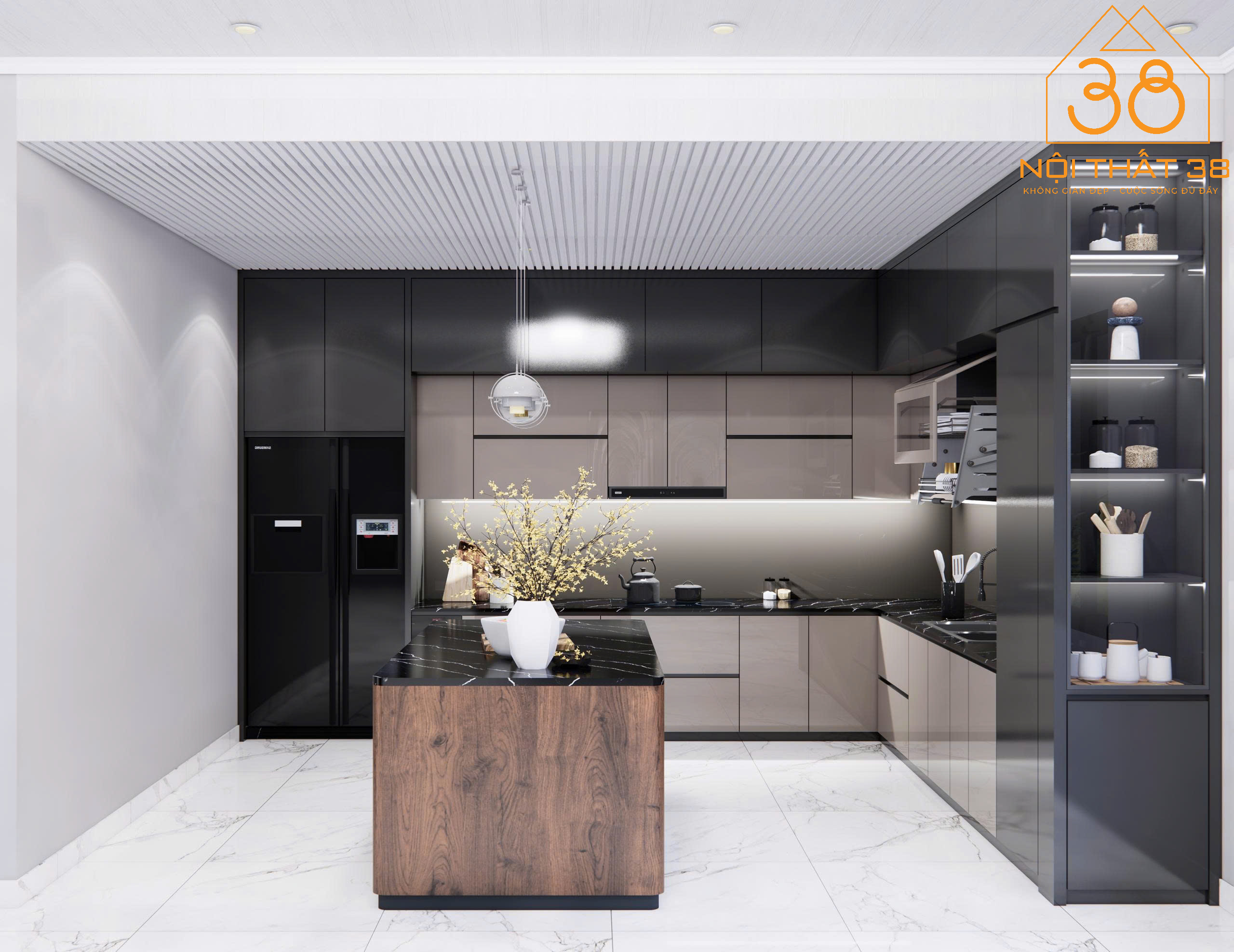 Phòng bếp: Thiết kế mở liền kề phòng khách, dùng chất liệu gỗ sáng màu, đèn thả trần mộc mạc